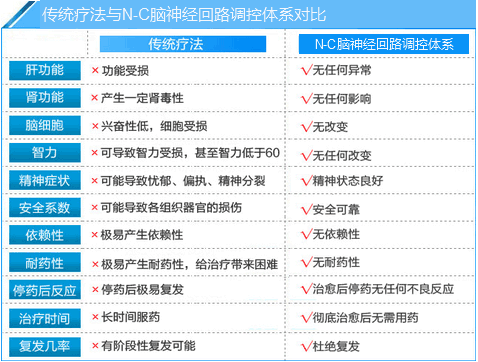 优势二:无药物治疗毒副作用 相比较传统药物治疗方法, “n-c脑神经回路调控体系”无药物毒副作用,人体不会产生抗药性,损害正常脏器的健康。